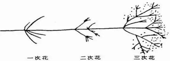 随着碳含量的增加,在芒线上继续爆裂产生二次花、三次花不等。在芒线附近所呈现的明亮的小点称为花粉。