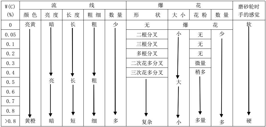 碳是钢铁材料火花的基本元素,也是火花鉴别法测定的主要成分。由于含碳量的不同,其火花形状不同。
