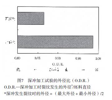 加工性是根据深冲加工试验后的外径比(O.D.R.)进行评价。图7所示为试验结果。开发材比比较材具有优良的加工性是因为有低摩擦性的氟树脂覆盖了表面,降低了模具与涂膜表面间的滑动抗力,降低了成型力,提高了成型极限的缘故。