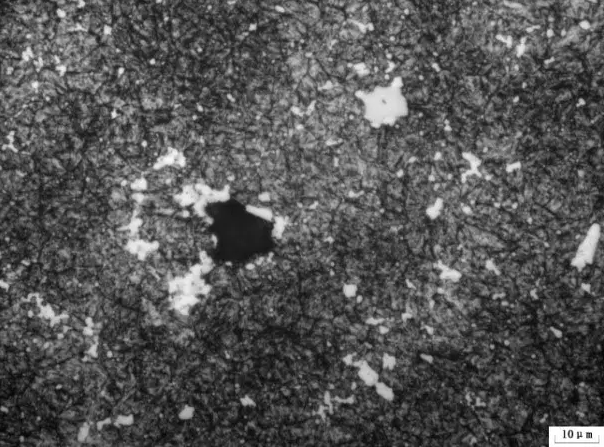 横向组织为回火马氏体+残留奥氏体+共晶碳化物+二次碳化物,碳化物也发生了明显的聚集,在碳化物聚集处,基体元素发生了较为明显的偏析,呈现亮白色。进一步放大,可看到明显的奥氏体晶界,为典型的过热组织。从图可看出碳化物聚集后的剥落坑。根据以上现象可判断,碳化物聚集是由于热处理不当造成组织过热而形成的。
