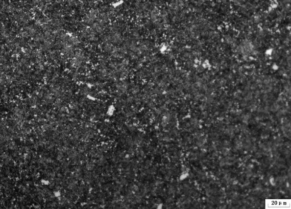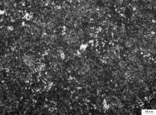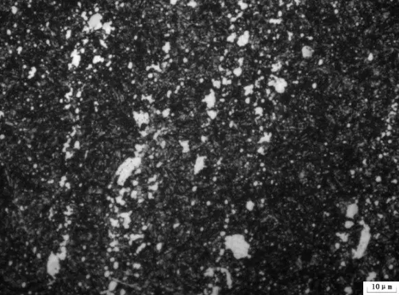 工艺改进后基体没有出现明显的块状的亮白色偏析区域,未看到明显的奥氏体晶界。未出现明显粗大的块状碳化物。碳化物粗大并发生偏聚的原因是,高速钢在高温加热时,合金元素在奥氏体中的溶解度有限,共晶碳化物的溶解温度较高,碳化物的溶解量很少,故加热过程中主要发生偏聚和粗化,以降低碳化物的界面能。