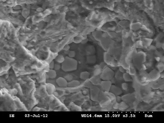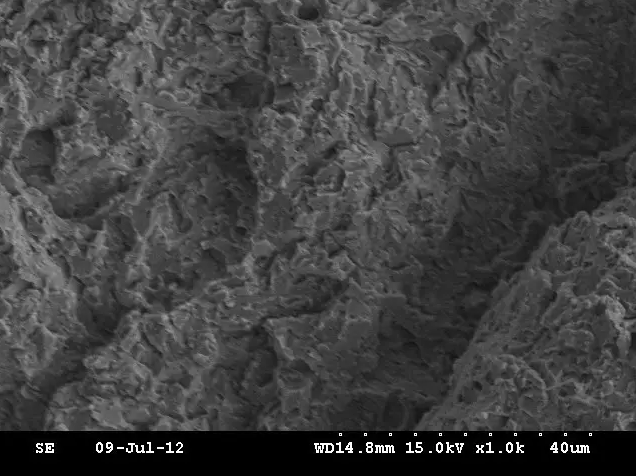 从断口的宏观形貌,可以看出,断口表面光滑平整,呈黑灰色,具有明显脆性断裂形式。同时,在断口边缘还产生了二次脆断,表明材料极脆。