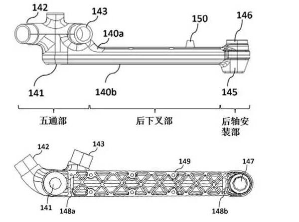 摩拜单车的底架主体由五通部、后下叉部和后轴安装部一体成型铸造,集成度高。如此一体式结构可使圆锥齿轮与中轴、后轴的圆锥齿轮轴交角均呈90度,实现了圆锥齿轮的标准化,节约了设计、加工、组装、维修等一系列成本。