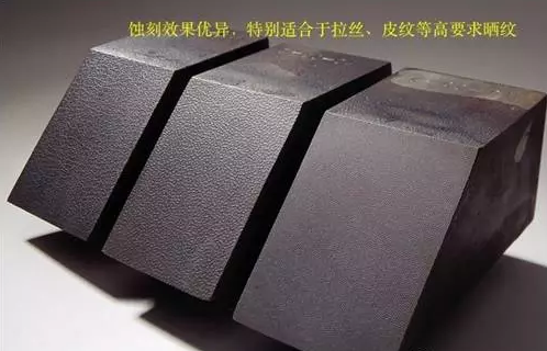 晒纹(蚀刻)效果是否好,与材料的纯洁度和均匀性有很大的关系,TOOLOX的材料是具有超高纯净度的钢材,P、S含量及非金属氧化物含量非常低,独特的热处理工艺技术,晶粒细小并且均匀,碳化物析出少,能有像TOOLOX这么好的基体组织是非常难得的,因此做晒纹处理效果非常优秀,特别适合拉丝等高要求的晒纹,其晒纹效果得到意大利权威部门的最高评价及认证:迄今为止最好的钢材!