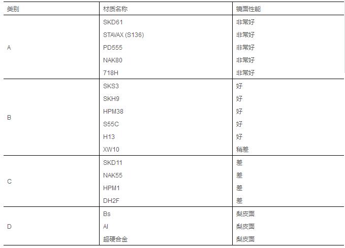 有些模具钢材的电火花加工能容易达到镜面效果(如NAK80),而有些模具钢材无论如何也达不到镜面效果(如SKD11)。同时,模具钢材的硬度高些,电火花加工镜面的效果更好。请参考下表各种材料与镜面加工性能。