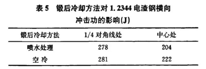 锻后冷却方法采用了扁钢喷水处理和空冷两种,表5数据显示两种冷却方法对横向冲击性能的影响没有明显差别,这可能是由于1.2344钢具有较高的淬透性造成的。