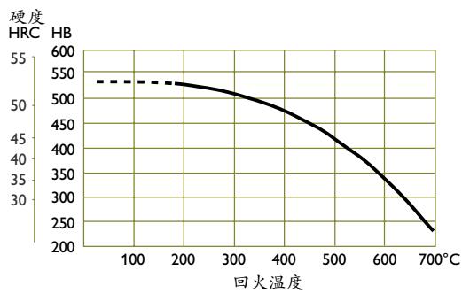 根据所需硬度,参考回火曲线图选择适当的回火温度。回火至少两次。每次回火后必须冷却至室温,对小模具可180℃回火,但是推荐250℃为最低回火温度,每次回火至少保温两小时。