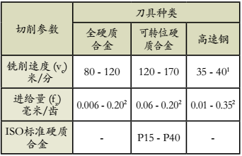 1涂覆高速钢端铣速度,vc=60-66米/分